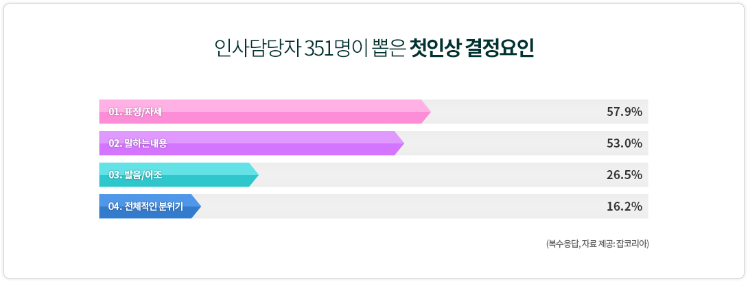 잡코리아가 인사담당자 351명을 대상으로 설문 조사한 결과 면접에서 첫인상이 결정되는 데까지 걸리는 시간은 평균 10분 5초인 것으로 나타났습니다. 10분 남짓한 짧은 시간에 인사담당자는 지원자의 어떤 면을 보고 첫인상을 결정 지을까요? '표정과 자세'를 본다고 답한 인담자가 57.9%로 가장 많았고, 이어 '말하는 내용'(53.0%), '발음·어조'(26.5%), '전체적인 분위기'(16.2%)를 보는 것으로 나타났습니다.
